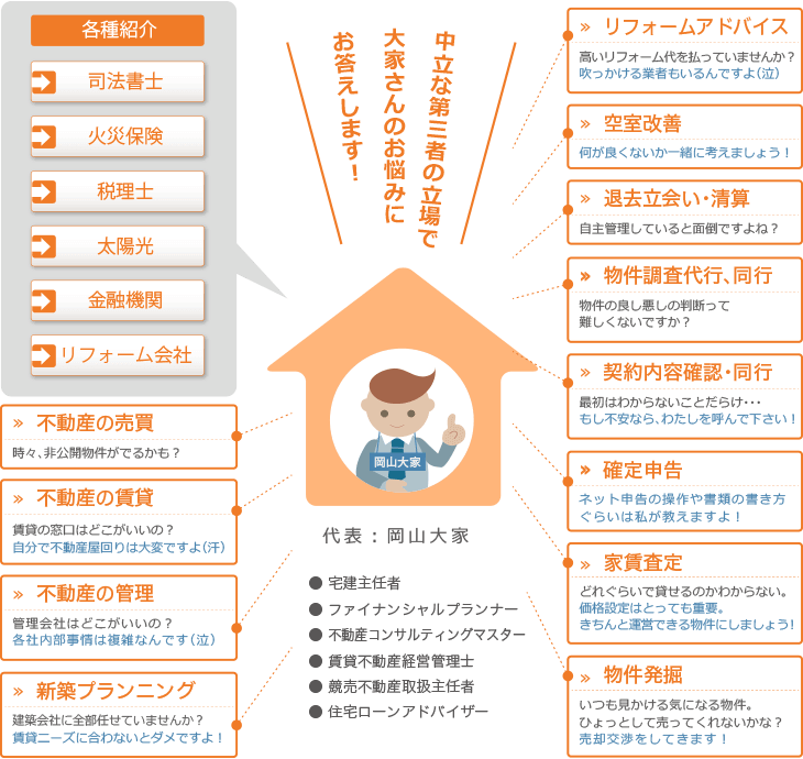 中立な立場で、大家さん(なりたい方も)をサポートします。
