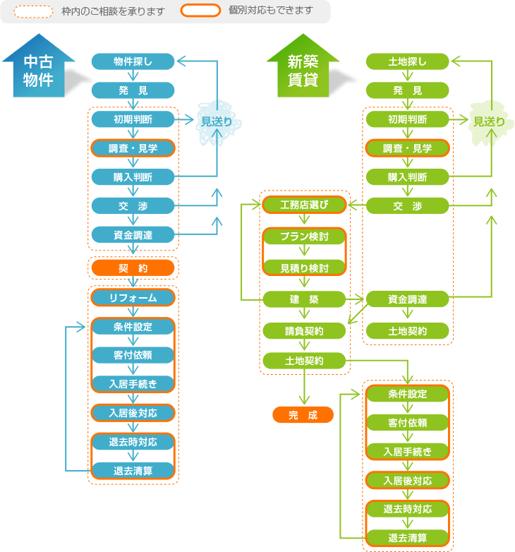 入居者に選ばれ、きちんと運営できる物件をおススメし、費用対効果を考えたリフォーム、入居者探し、良心的な管理会社探しなど、幅広くお手伝いをさせていただきます。